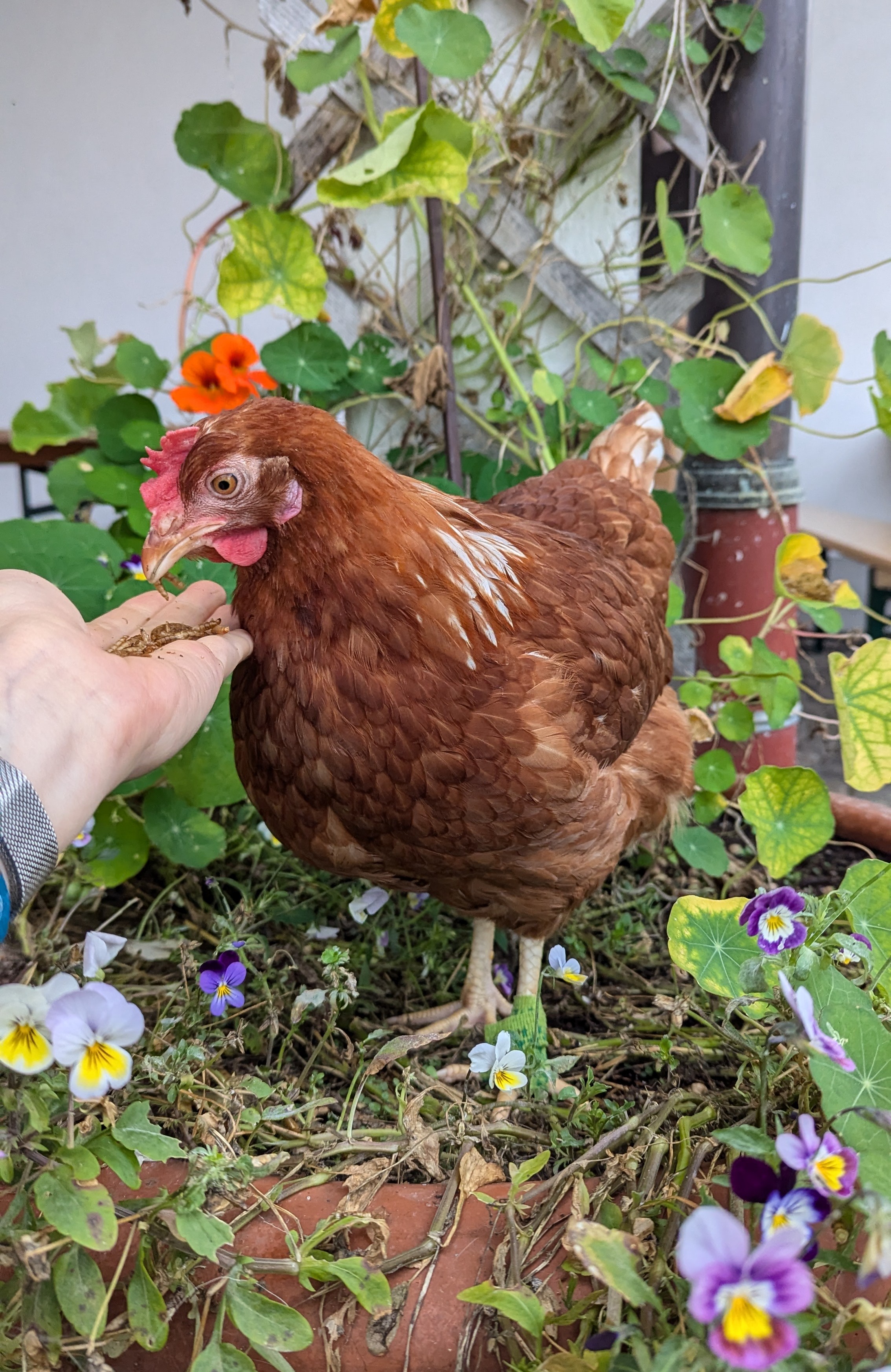 Carol kam im Juli 2024 zu uns. Wir haben sie und ihre 3 Kolleg:innen „The Chordettes“ genannt, nach der erfolgreichen U.S.-amerikanischen Girlgroup aus den 50er Jahren. Die vier Hühner-Mädels wurden wie so viele Legehennen künstlich ausgebrütet und wuchsen ohne Mutter auf. Im Alter von etwa sechs Monaten wurden sie in einen anderen Betrieb gebracht - einen Legebetrieb im Umkreis von München mit circa 250 Hühnern. Sie lebten in Bodenhaltung, was bedeutet, dass sie nie nach draußen durften. In diesem Betrieb wurden sie nur zum Eierlegen gehalten, das war ihre vom Menschen zugedachte Bestimmung. Als der Betrieb aufgelöst wurde, sollten alle Hühner getötet werden. Doch eine engagierte Tiermedizinstudentin erfuhr von der geplanten Tötung und griff ein. Es gelang ihr nach einiger Überzeugungsarbeit, dem Landwirt die verbliebenen Hühner abzukaufen. Und so kamen die vier nach Kuhtopia. Carol war von Anfang an ziemlich neugierig und hatte nicht viel Angst vor uns Menschen. Da sie einen Ballenabszess hatte, der nur langsam verheilte, mussten wir sie für längere Zeit von der großen Hühnergruppe trennen. In dieser Zeit wurde sie richtig anhänglich und folgte uns auf Schritt und Tritt. Carol ist unheimlich frech und forsch und liebt unser Schweinefutter abgöttisch. Sie ist es den Schweinis sogar direkt unter der Schnauze weg. Die lassen sich das meist gefallen - sie scheinen Respekt vor Carols Dreistigkeit zu haben.