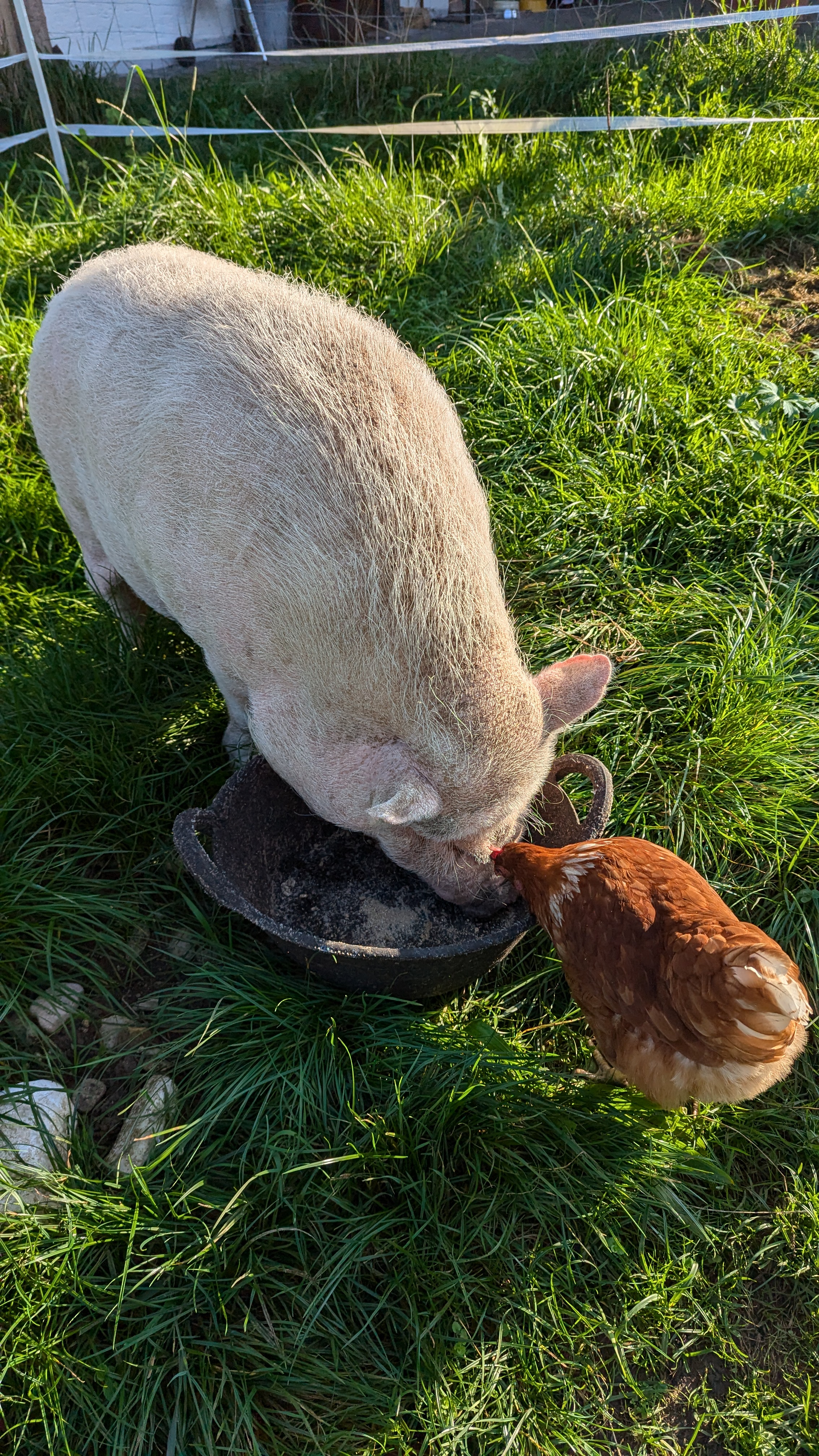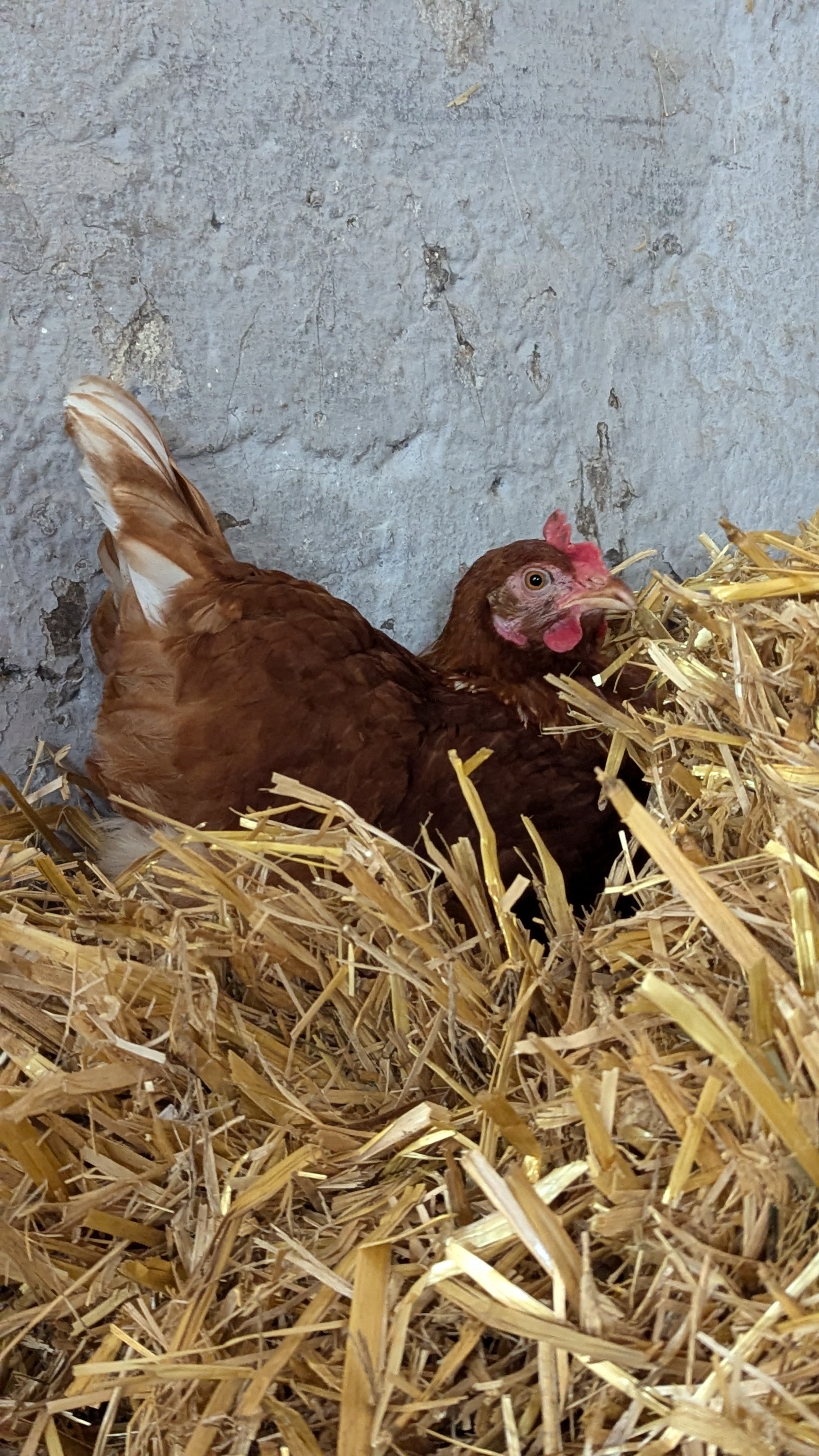 Carol kam im Juli 2024 zu uns. Wir haben sie und ihre 3 Kolleg:innen „The Chordettes“ genannt, nach der erfolgreichen U.S.-amerikanischen Girlgroup aus den 50er Jahren. Die vier Hühner-Mädels wurden wie so viele Legehennen künstlich ausgebrütet und wuchsen ohne Mutter auf. Im Alter von etwa sechs Monaten wurden sie in einen anderen Betrieb gebracht - einen Legebetrieb im Umkreis von München mit circa 250 Hühnern. Sie lebten in Bodenhaltung, was bedeutet, dass sie nie nach draußen durften. In diesem Betrieb wurden sie nur zum Eierlegen gehalten, das war ihre vom Menschen zugedachte Bestimmung. Als der Betrieb aufgelöst wurde, sollten alle Hühner getötet werden. Doch eine engagierte Tiermedizinstudentin erfuhr von der geplanten Tötung und griff ein. Es gelang ihr nach einiger Überzeugungsarbeit, dem Landwirt die verbliebenen Hühner abzukaufen. Und so kamen die vier nach Kuhtopia. Carol war von Anfang an ziemlich neugierig und hatte nicht viel Angst vor uns Menschen. Da sie einen Ballenabszess hatte, der nur langsam verheilte, mussten wir sie für längere Zeit von der großen Hühnergruppe trennen. In dieser Zeit wurde sie richtig anhänglich und folgte uns auf Schritt und Tritt. Carol ist unheimlich frech und forsch und liebt unser Schweinefutter abgöttisch. Sie ist es den Schweinis sogar direkt unter der Schnauze weg. Die lassen sich das meist gefallen - sie scheinen Respekt vor Carols Dreistigkeit zu haben.