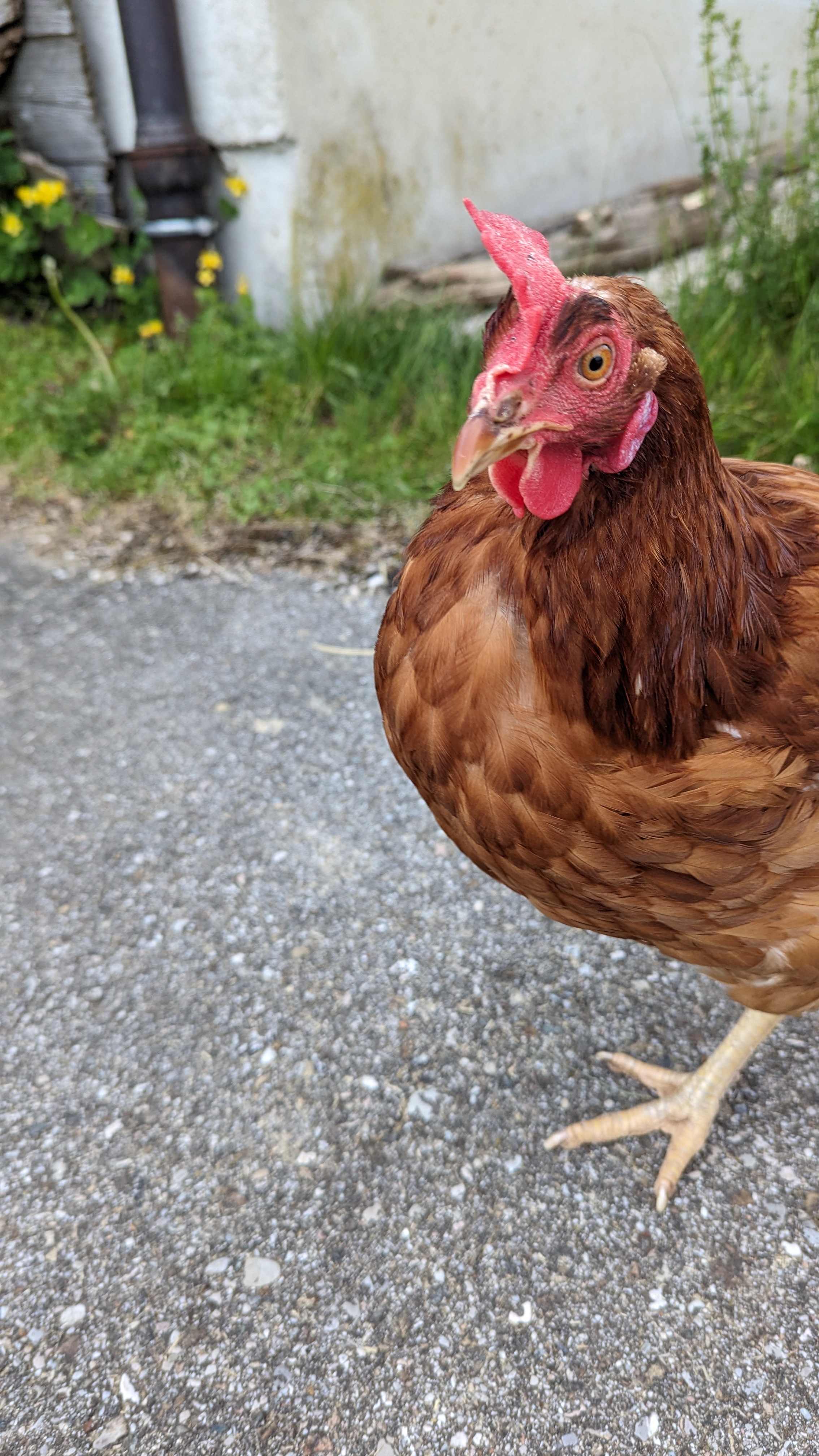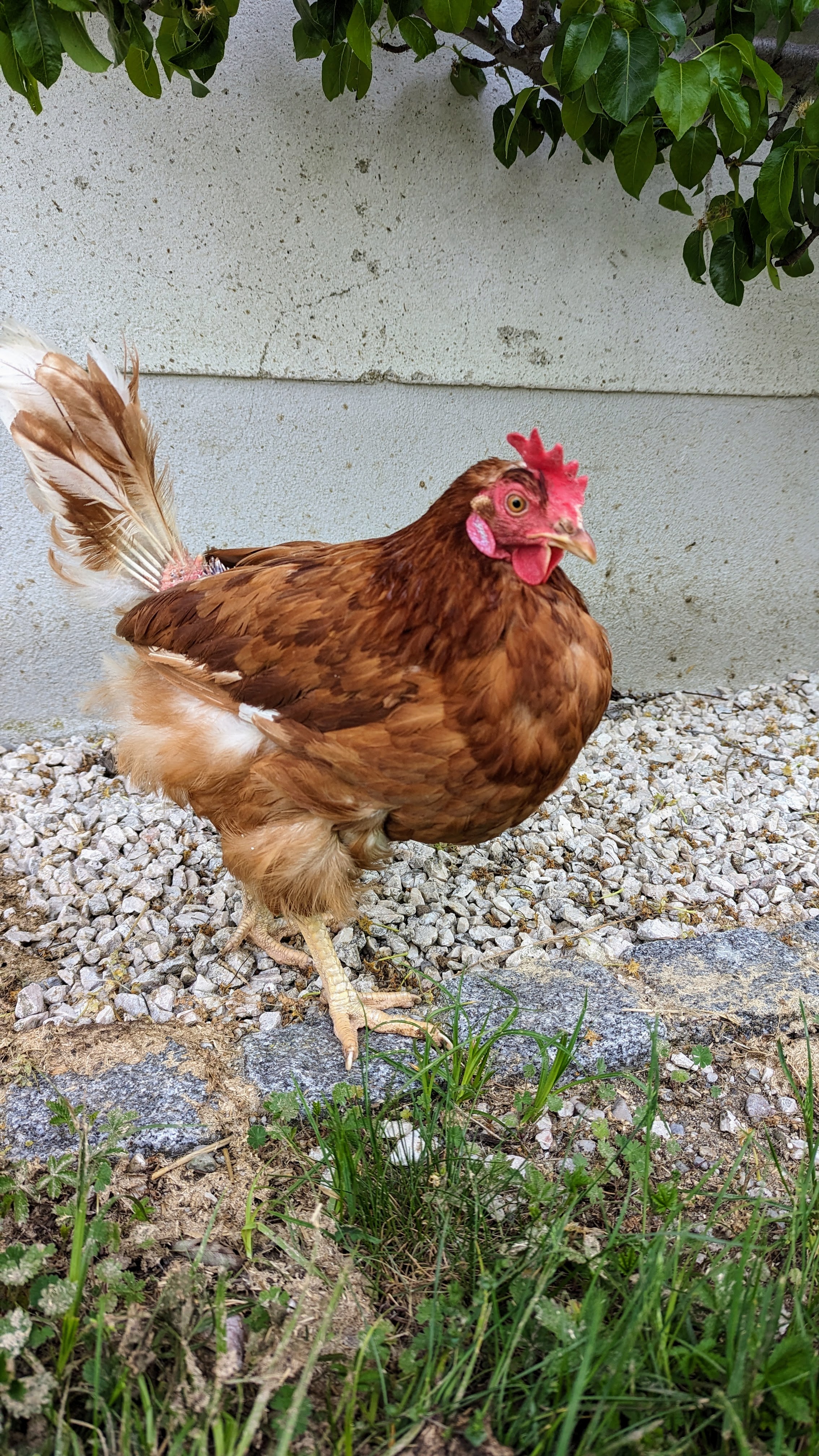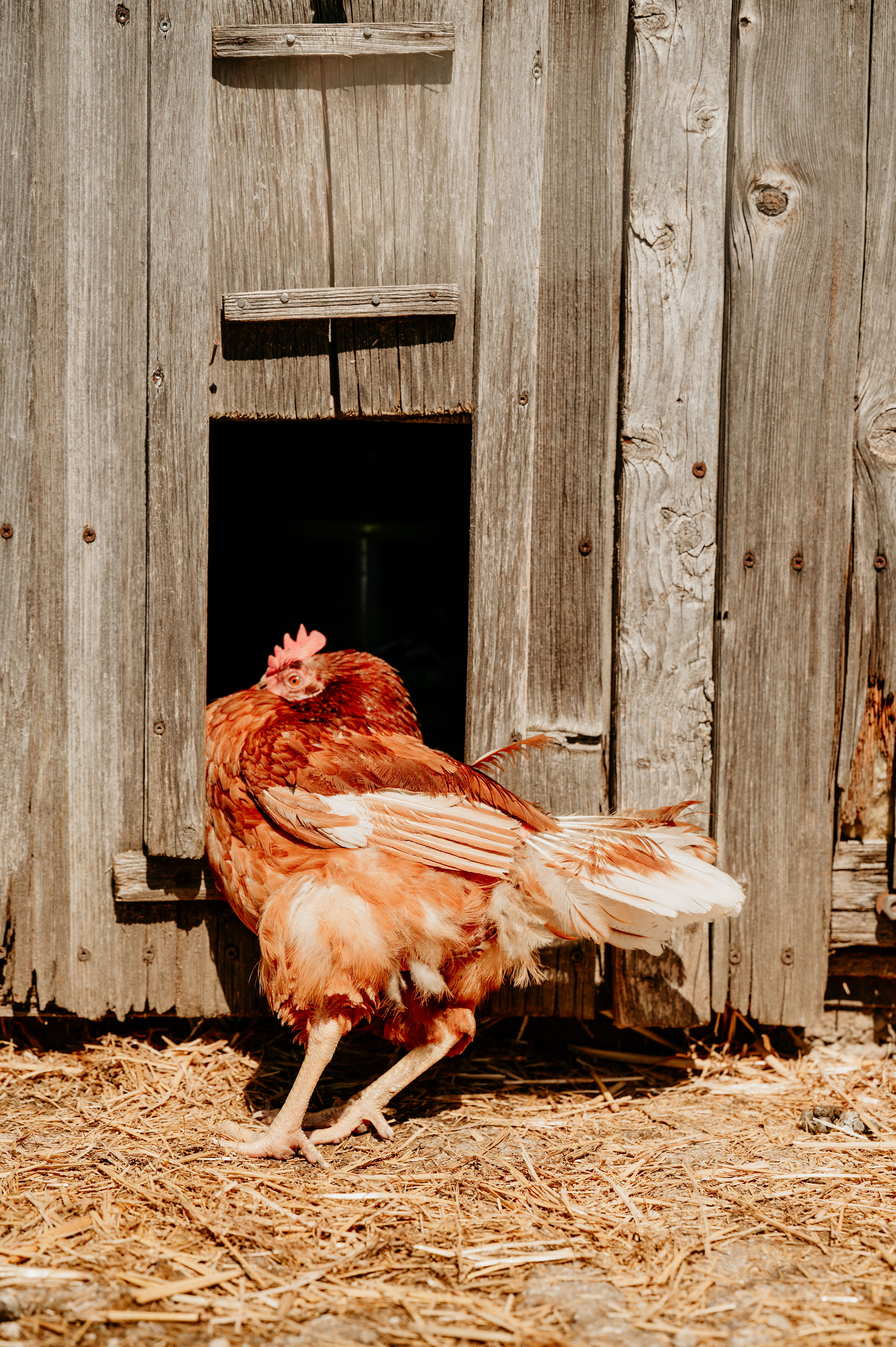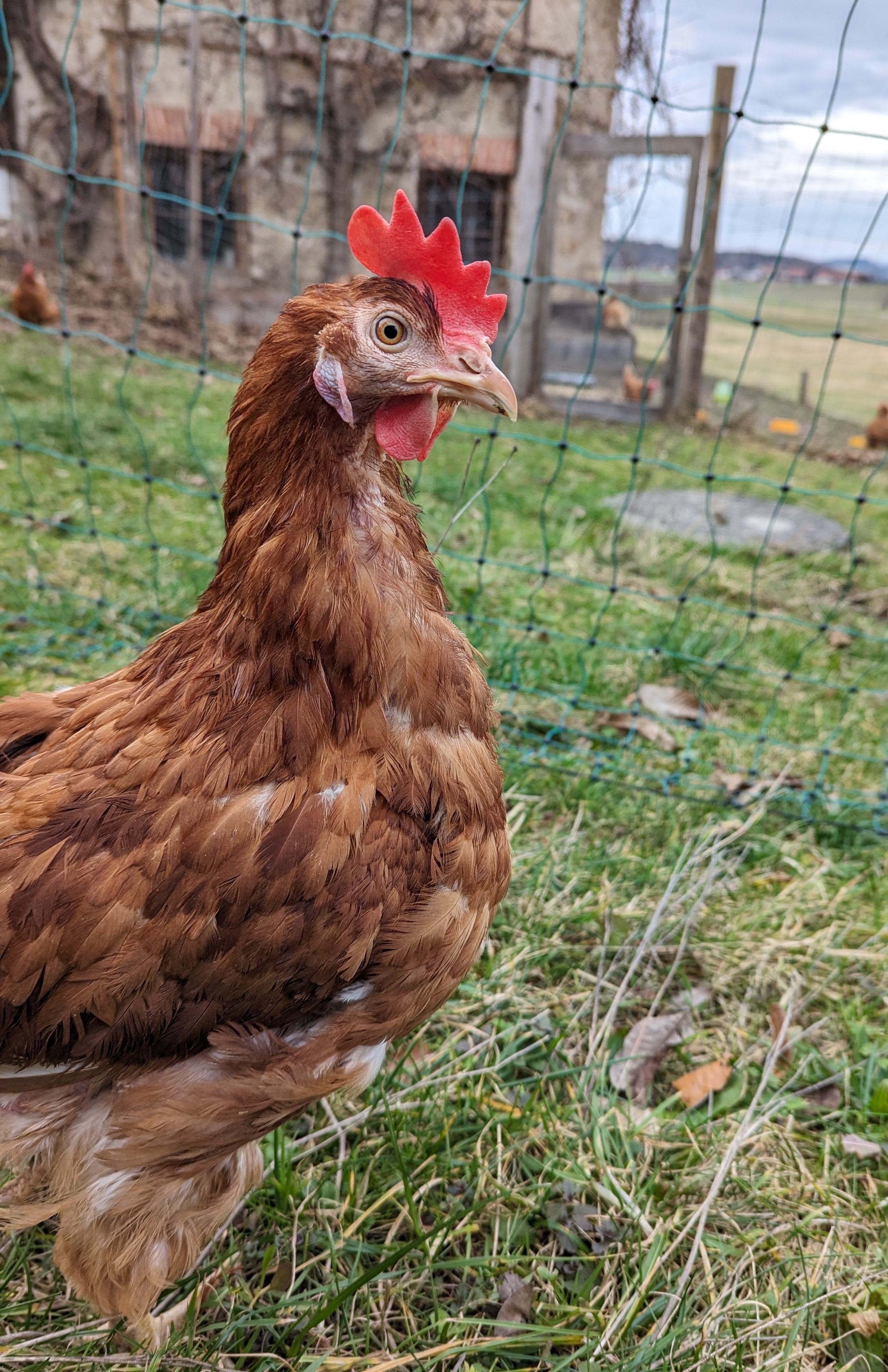 Karla ist im Januar 2024 aus einem großen Bodenhaltungsbetrieb zu uns gekommen. Sie wurde künstlich ausgebrütet, wuchs ohne Mutter auf und lebte dann mit tausenden anderen Hühnern zusammen in einer großen Halle, ohne Auslauf, auf verdrecktem Boden und Metallregalen - alles für die Eierproduktion. Karla kam gemeinsam mit Marilyn und Principessa zu uns. Sie war von Anfang an die mutigste unter den Neuankömmlingen. Karla war auch die erste der drei, die sich aus dem Stall hinaus an die frische Luft traute. Da sie vorher noch nie unter freiem Himmel war, gab es zunächst viele Dinge, die Karla und ihren Freundinnen Angst machten. Doch Karla ging mutig voran und so trauten sich bald auch die anderen beiden hinaus. Schon nach wenigen Tagen wollten die drei dann am liebsten gar nicht mehr nach drinnen. Sie haben sich inzwischen alle ganz wunderbar entwickelt. Wo sie vorher kahle Stellen hatten, sind sie nun von flauschigen Federn eingehüllt. Wir wünschen der mutigen Karla weiterhin viel Spaß in ihrem neuen Leben.